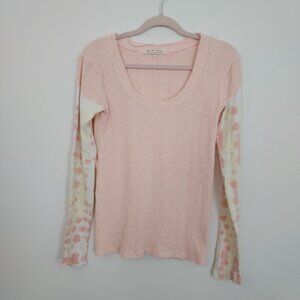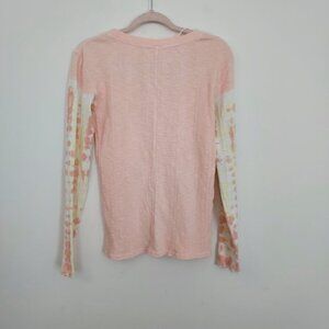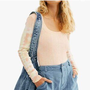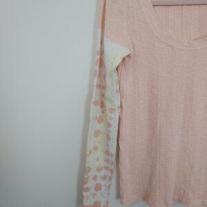 Size large We The Free Big Sur Long Sleeve Ribbed Tee. 95% cotton/5% elastane. Peachy pink with white & yellow tie dye sleeves. Scoop neck. Raw cut hem. Ribbed knit. Pit to pit 15" Length 24.5". Excellent pre-owned condition