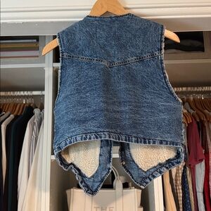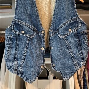 Chic denim vest with soft sherpa lining. Features a classic design and comfortable fit.