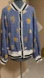 Chic blue cardigan with gold patterns. Button-up style. Relaxed fit for everyday comfort.