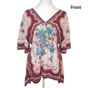 perfectly printed with that crafty Free People touch. This sweet top will turn heads from this season to the next. It has a billowy, trapeze inspired silhouette, and features a V-neckline, draped sleeves, asymmetrical hemline, and a vintage-inspired print throughout. It is made from a soft linen blend fabric and is designed to have a free-spirited and feminine aesthetic, consistent with Free People's brand identity.