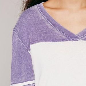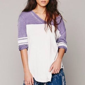 Hard to find periwinkle and white colored Free People We The Free Breaker Raglan Tee. Distressed washed top with V neckline, 3/4 length sleeves, and shirttail hem. Color blocking and stripes lend a sport feel to this ultra-comfy tee. Super soft, constructed of 50% cotton/ 50% polyester. In great condition with a very faint discoloration on the back left, see photos.
