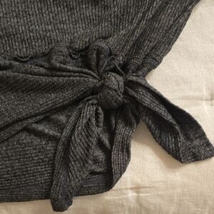 Very oversized. Chic off-shoulder style. Soft charcoal knit. Ideal for relaxed outings.