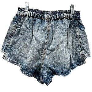 These micro shorts feature a pull-on elastic gathered waistband with a single button closure, front pockets, belt loops, and side panels with a step hem. Light distressed denim, good condition, size small