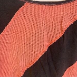 Loose-fitting top, can be worn off the shoulder. Undone hem for the care-free look. Grey top with orange mesh-like material diagonal chunky stripes.