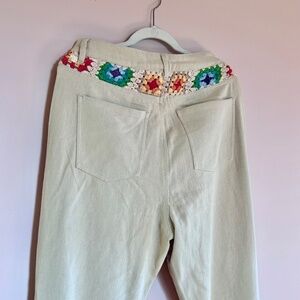 Elevate your denim game with these We The Free cream jeans, featuring bold crochet panel detailing in multicolor hues. A true statement piece, these jeans blend rugged vintage charm with handcrafted softness โ giving major boho, festival, and coastal cowgirl energy. Originally retailing at $300, this pair is a high-end gem at an accessible price point.