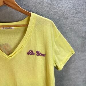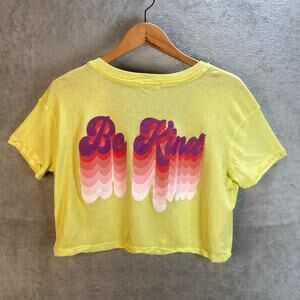 Eye-catching cropped t-shirt with a playful twist. This vibrant yellow tee features a flattering V-neck and short sleeves, adorned with the cheerful messages 'Be Cool' on the front and 'Be Kind' on the back. The relaxed fit and raw-edge hem give it a casual, lived-in feel. Pair it with high-waisted jeans for a trendy everyday look, wear it to a casual weekend brunch, or pack it for a fun summer vacation.
