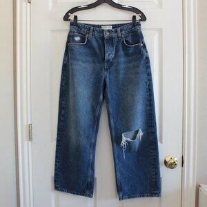we the free jeans, free people jeans, barrel leg jeans, low rise jeans, lightly distressed, medium wash, relaxed fit,