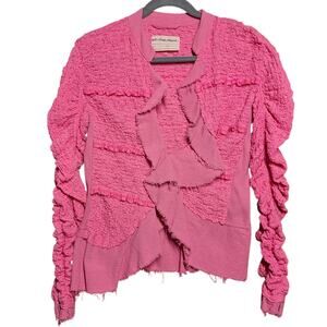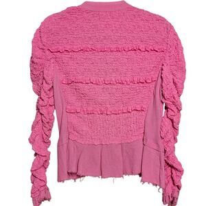 in excellent condition from we the free by free people women's size medium "Demi ruffle lace textured jacket" single hook and eye closure really funky artsy layered unique Y2K look bright bubble gum pink