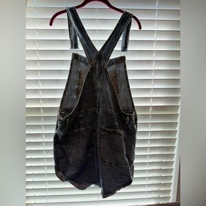 Stylish denim overalls. Features adjustable straps. Front and side pockets.
