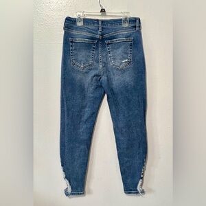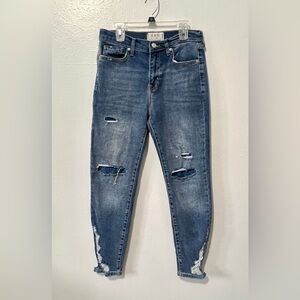 We The Free (Free People) branded denim boyfriend style jeans with lined distressed details on front, and front and back distressed hems on both legs, lighter medium wash color, higher rise, tapered leg, front and back pockets, zipper and button closure.