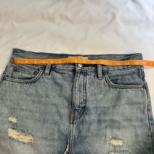 We The Free Distressed Denim Mini Skirt Medium Wash Pockets Size 27 Rigid Preppy