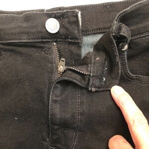 Super cute We the Free stretch black denim mini skirt. Cross-over piece in front adds a unique detail. In excellent preowned condition. Pockets front and back, zip closure with metal button.