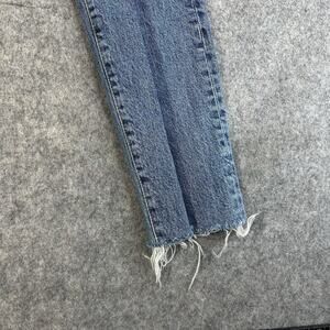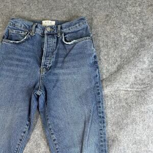 The We The Free Free People Jeans 28 Button Fly Raw Hem Distressed Skinny High Rise are a stylish and versatile addition to any woman's wardrobe. These denim jeans feature a solid blue color with a raw fabric wash, giving them a unique and edgy look. The high-rise waist and skinny fit flatter the figure, while the distressed detailing adds a touch of attitude. With a 5-pocket design and button and zip closure, these jeans are both fashionable and functional, making them perfect for all seasons. Made by the popular brand Free People, these jeans are a must-have for any fashion-forward woman.