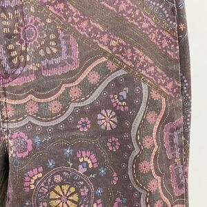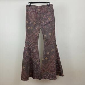 Free People mega flare jeans, size 30. Purplish brown denim with a boho geometric/floral print design. 2 back pockets. These jeans would be great for festivals, concerts, or to just add some flare to your day.