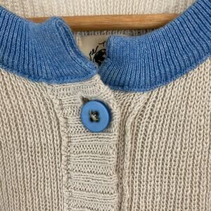 Linen & cotton cardigan with a button front and slouchy fit. Ribbed trim. Light blue contrast neck and sleeve ends.