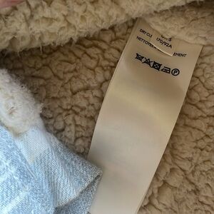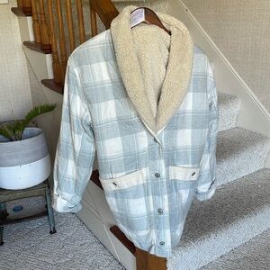 Great pre loved condition size small, oversized chunky style and fit. Gray and white in color with tan Sherpa lined inside. Buttons down the front, two hand pockets. Perfect plaid cabin flannel by we the free, free people.