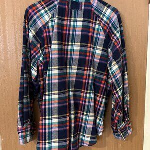 Features: Soft cotton fabrication, plaid print, collared-neckline, button-front closures, raglan cut sleeves with cuffs, contrast seam detailing, shirttail hem