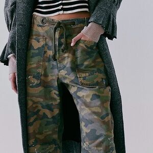 These fan-favorite barrel jeans from We The Free feature mixed print camo fabrication with paint splats, oversized patch pockets, drawstring waistband and a button fly. Pants are a great design, only wore a few times but always looked great!
