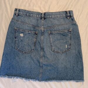 Trendy blue mini skirt with a raw hem and distressed grunge look. Perfect for casual outings. 100% cotton.