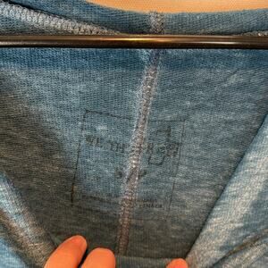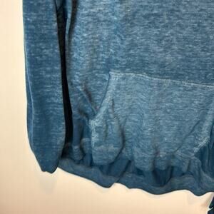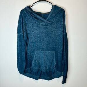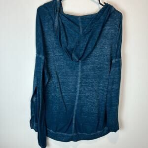 We The Free Hoodie Sweatshirt Top. This is a women's small. Love this shade of blue / green. This is very thin, almost sheer. I would say it is slightly oversized for a small as it fit me and I am a medium. Front pocket. Big hood. 50% polyester, 38% cotton, 12% rayon.