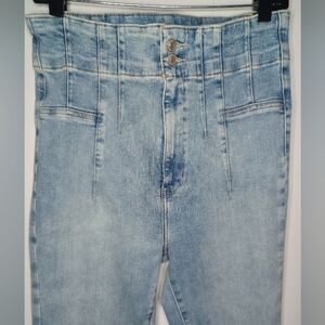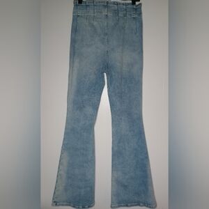 Stylish light blue jeans with a wide leg flare. Perfect for a chic, casual look.