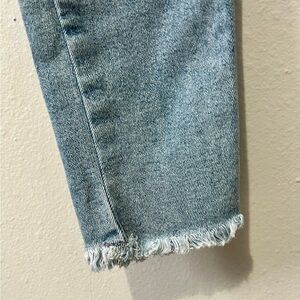 We The Free (Free People) branded denim jeans in a light wash color, knee slit distressed detail, settle raw fringe hem, higher rise, front and back pockets, zipper and button closure. These have a fair amount of stretch but run slightly on the small side, please see photos for measurements.