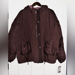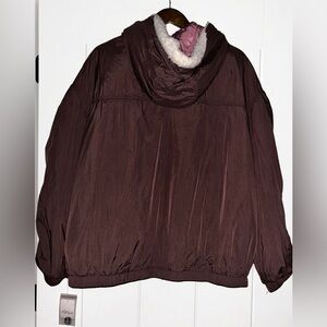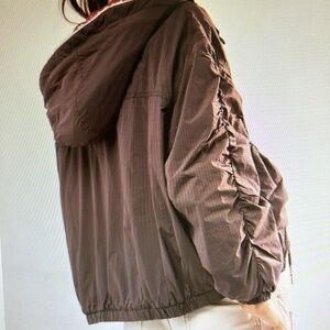 Style: classic bomber, sporty nylon, ruched detail on sleeve , Sherpa trimmed hood, oversized puffy, insulated hem & cuff, drawstring front pockets, button & zipper closure, quilted hood