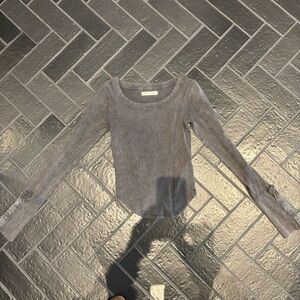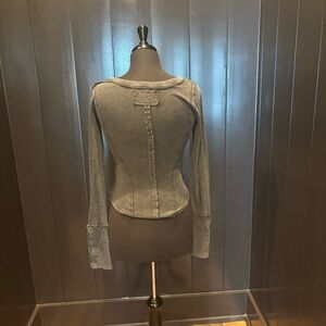 Washed black long sleeve top from We The Free by Free People, featuring corset-style exposed seams, a scoop neckline, and dramatic flared sleeves. Fitted and stretchy with a soft ribbed texture and mineral-washed finish. Total off-duty model vibes.