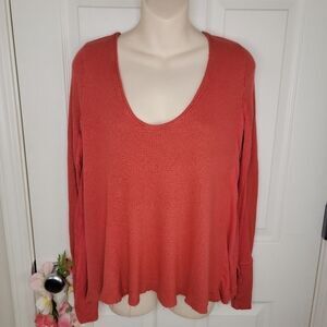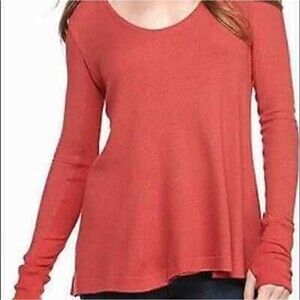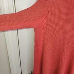 Good, preloved condition. Free People | We the Free Malibu Thermal Top. Raw edge thermal. High low hem. Thumbhole details. Long sleeves. Scoop neck. Oversized. Washed red, red-orange shade.