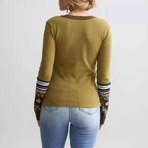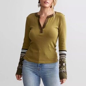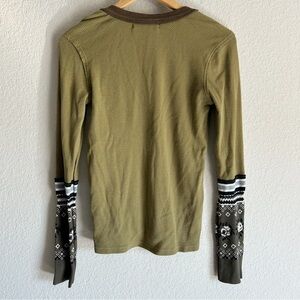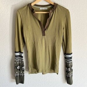 We The Free Mikah Notch Neck Top Knit Long Sleeves Extended Cuffs Army Combo M.