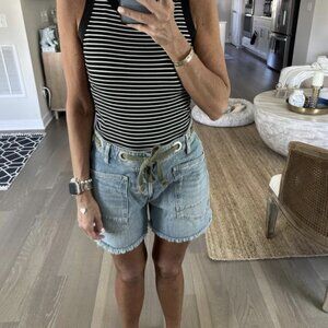 Features: Pull-on design, drawcord waist detail, oversized pouch pockets, raw-edge hem