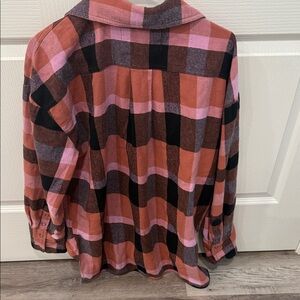 Vibrant plaid shirt with a mix of pink, black, and brown. Ideal for casual outings.flannel size small will definitely fit med