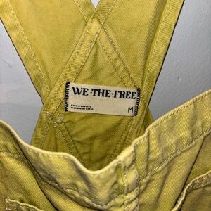 Chic mustard denim overalls. Adjustable straps. Front pocket. Side button closures.