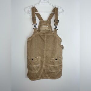Stylish tan overall dress featuring front pockets. Perfect for casual outings.