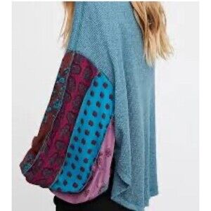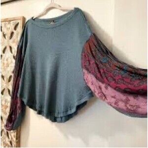 The product is a We The Free People Blossom Thermal Balloon Sleeve Oversized Pullover Top in size Small. It features long balloon sleeves and a round neckline, making it a comfortable and stylish choice for casual occasions such as travel. The top is made from a blend of rayon and cotton, making it machine washable and suitable for winter and fall seasons. Its relaxed fit and oversized design give it a hippie, bohemian, and peasant-style look that is perfect for women looking for a basic yet trendy blouse.