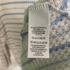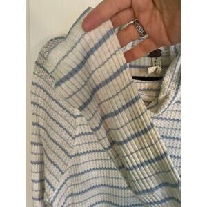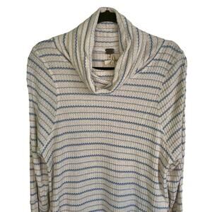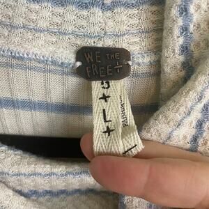 We The Free Free People Lightweight Waffle Sweater - High/low cut, cowl neck, oatmeal color with light blue stripes, long sleeve, stretchy material.