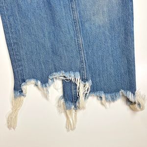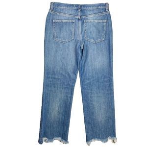 Style: Mid-rise, cropped length, straight leg, fading and whiskering, destroyed hem, button fly closure, non-stretch