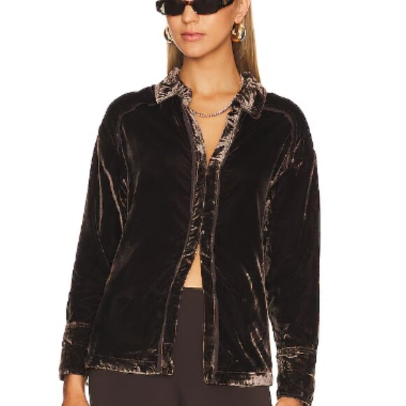 This is the Marianne style shirt from We the Free / Free People. Brown velvet fabric. Partial hidden front hook and eye closure. Split cuffs with hook and eye closure. Velvet fabric with frayed edges.