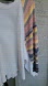 White sweater with colorful striped sleeves. Features shades of blue, pink, yellow, and brown.