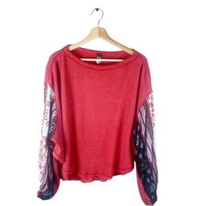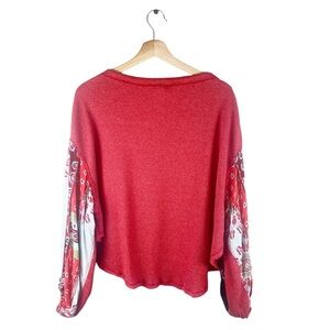 Vibrant red blouse with multicolor paisley sleeves. Relaxed fit. Perfect for casual wear.