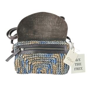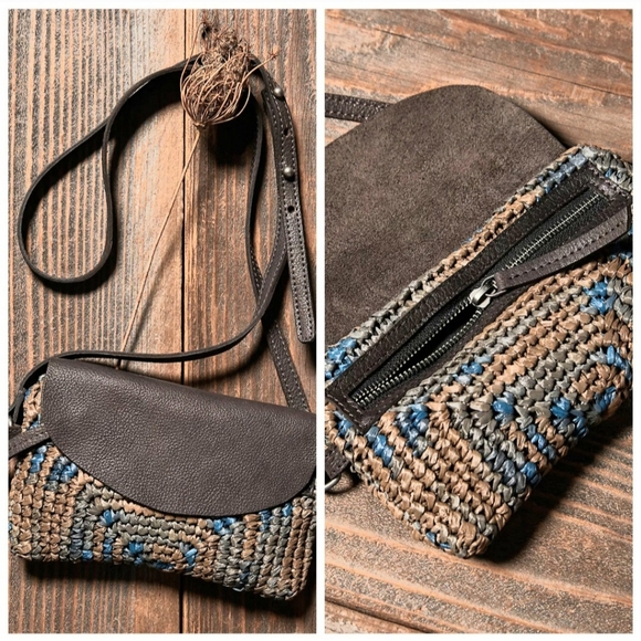 NWT; Raffia straw in a woven design, soft leather flap, zipper closure, thin adjustable strap, compact design.