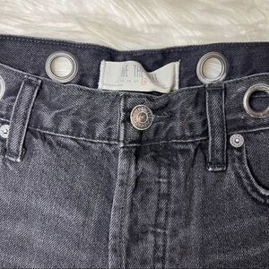 Washed black gray vintage-inspired cutoff jean denim shorts by We The Free from Free People. Boho style. Button fly. Flattering fold-up details to make your legs appear longer. Metal grommets at waistband, no sash. 100% cotton.