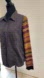 Charcoal button-up shirt with vibrant knit sleeves. Unique and stylish design.