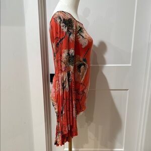 This vibrant blouse from We The Free features an asymmetrical design with pleated details, offering a unique and stylish look. The bold orange and red colors make it a standout piece, perfect for adding a pop of color to any outfit. Its lightweight fabric ensures comfort and a flattering drape.