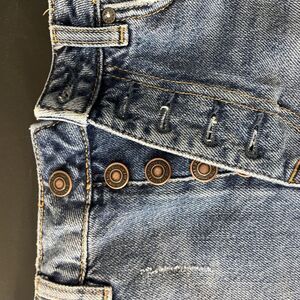 Features: Button fly closure (4 metal buttons); five-pocket styling; raw frayed hem; intentional distressed details/abrasions; front seam detailing; back patch pockets