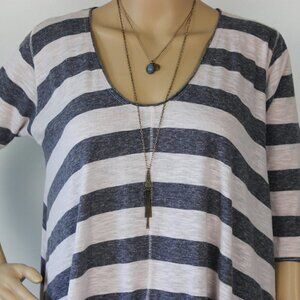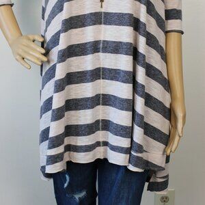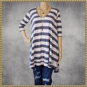 This stylish tunic top is by We The Free and is in very good preloved condition. It features elbow-length sleeves for a flattering and comfortable fit. The asymmetrical hem adds a unique touch to the design. It showcases light blush and gray stripes, creating a subtle and trendy look. The scoop neck enhances the neckline, and the extreme A-line style with side slits adds movement and flair.