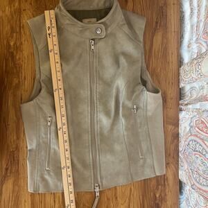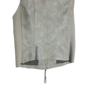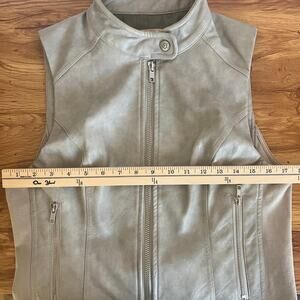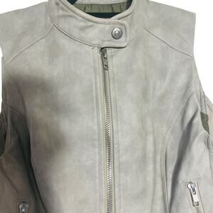 Vegan leather fabrication, button-snap neckline, zipper closure, sleeveless, zipper side pockets, seamed details.