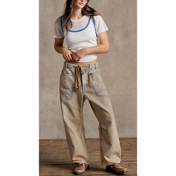 Stylish wide leg jeans. Features large front pockets. Comfortable and trendy design.