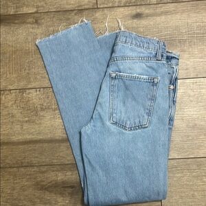 Light fading and whiskering detail. Frayed raw cut hem.