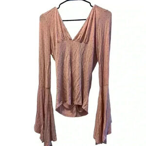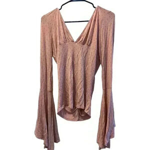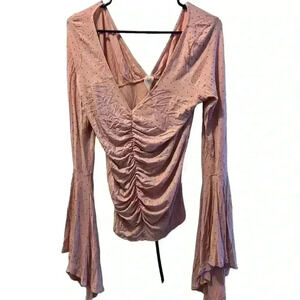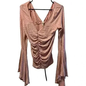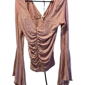 We The Free Women's Boho Bell Sleeve Ruched V-Neck Blouse Pink Polka Dot